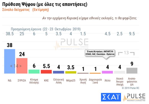 Συγκεκριμένα, στην πρόθεση ψήφου, η ΝΔ λαμβάνει το 38% έναντι 24% του ΣΥΡΙΖΑ, με το Κίνημα Αλλαγής να ακολουθεί τρίτο, με 6%. Το ΚΚΕ κινείται το 5,5%, η Ελληνική Λύση του Κυριάκου Βελόπουλου στο 4%, ενώ το ΜέΡΑ25 του Γιάνη Βαρουφάκη στο 3,5%.