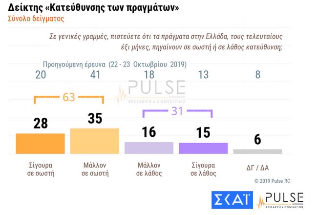 Το 63% των πολιτών θεωρεί ότι τα πράγματα πηγαίνουν προς τη σωστή κατεύθυνση, έναντι 31% που πιστεύει ότι πηγαίνουν προς την λάθος.