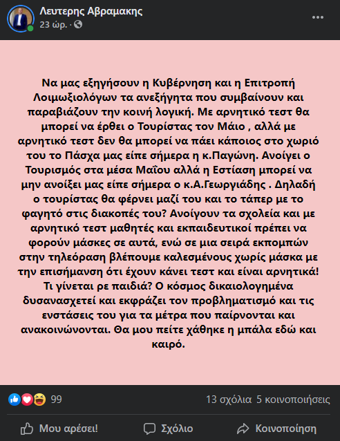 Επι παντός επιστητού παρεμβαίνων ο βουλευτής του Σύριζα Λευτέρης Αβραμάκης , ο οποίος αναφερόμενος στο θέμα των τεστ που γίνονται για τον COVID-19 ( rapid ,self ,μοριακό ) κάπου τα ¨¨μπέρδεψε ¨¨ .Με παρέμβαση της η πρώην βουλευτρια Αφροδίτη Σταμπουλή ως γιατρός φρόντισε ¨¨κομψά ¨¨ να διορθωσει τον βουλευτή. Ο οποίος έσπευσε να απαντήσει οτι γνωρίζει αλλά .....Διαβάστε την απάντηση