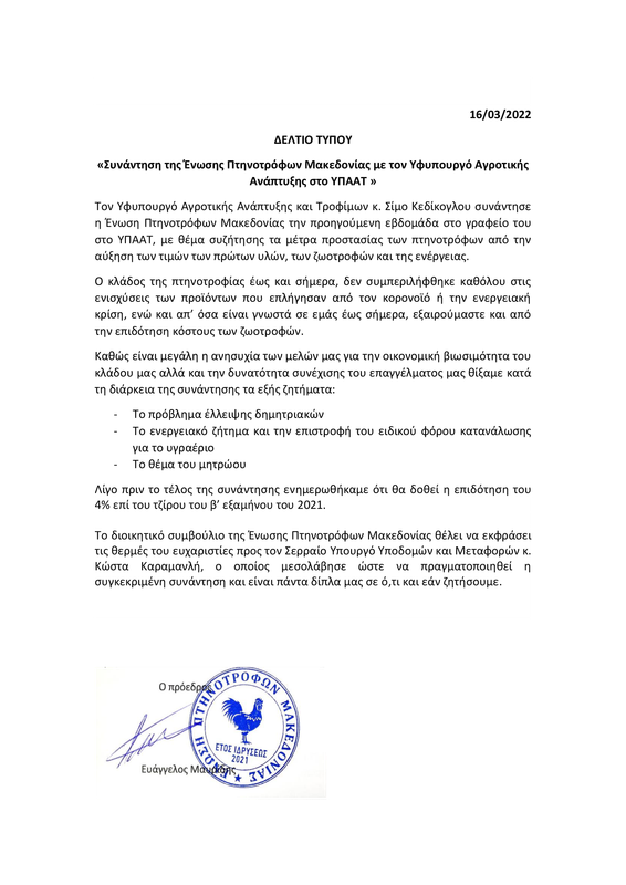 Ευχαριστήριο δελτίο τύπου της Ένωσης Πτηνοτρόφων Μακεδονίας προς τον Υπουργό κ. Κωνσταντίνο Καραμανλή...