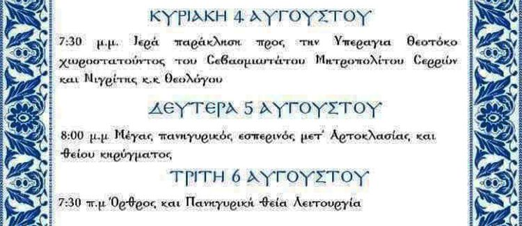 Πρόγραμμα πανηγύρεως Μεταμόρφωσης του Σωτήρος στην Ορέσκεια Σερρών